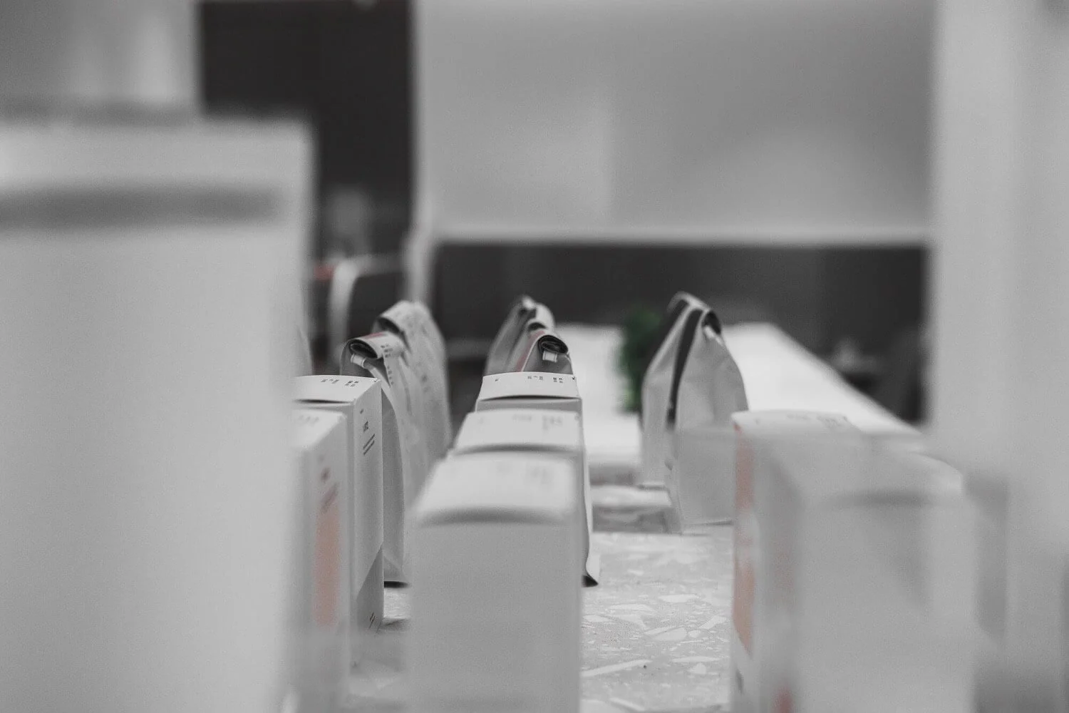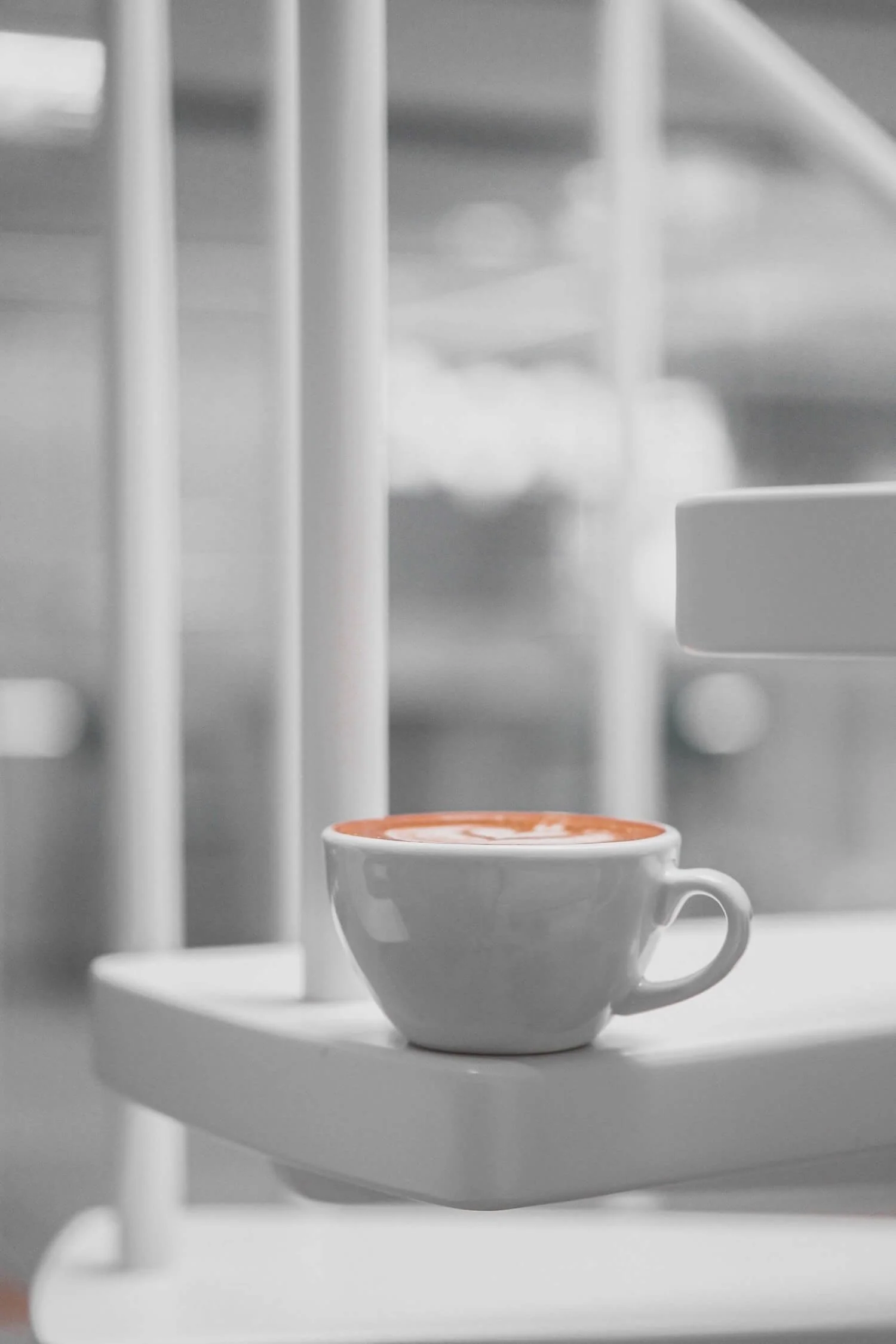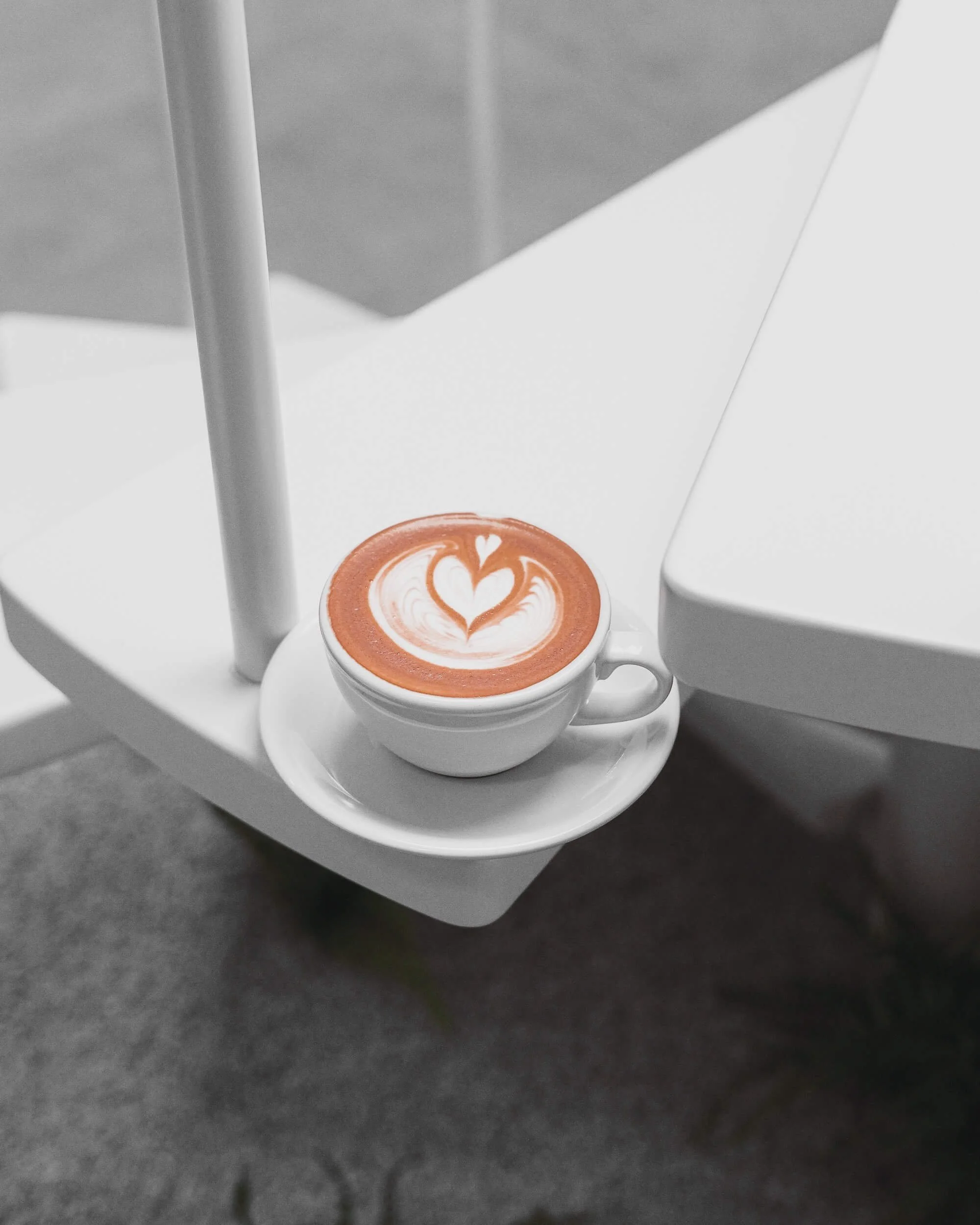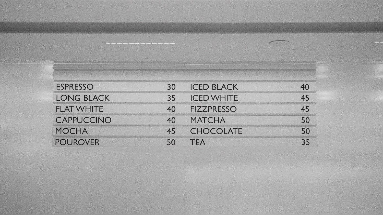 As you ride up the escalator from the street, the striking white neon NOC logo comes into view. As you near the top, the coffee counter comes into focus, complete with their iconic white coffee machine. The interior boasts a minimalist aesthetic with a color palette of white and grey. A variety of seating arrangements are available, ranging from individual tables to booths.